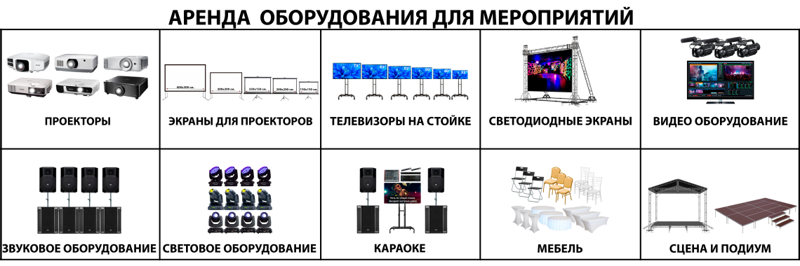 Предлагаем в аренду презентационное, звуковое, световое, видео оборудование, а также мебель и оргтехнику.