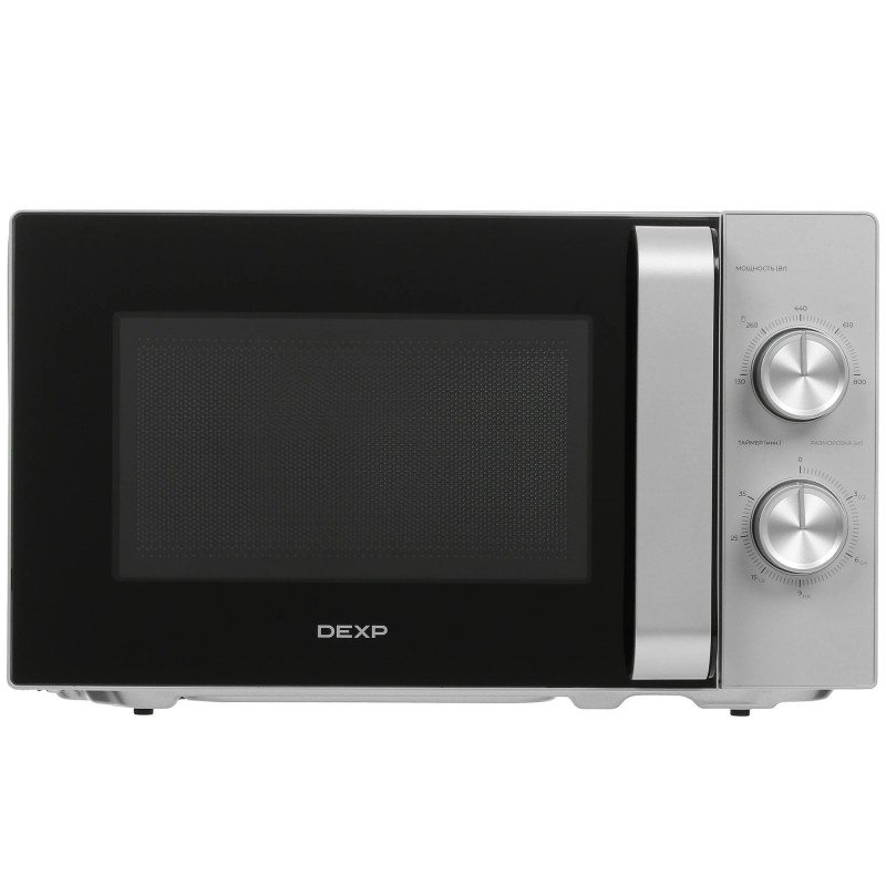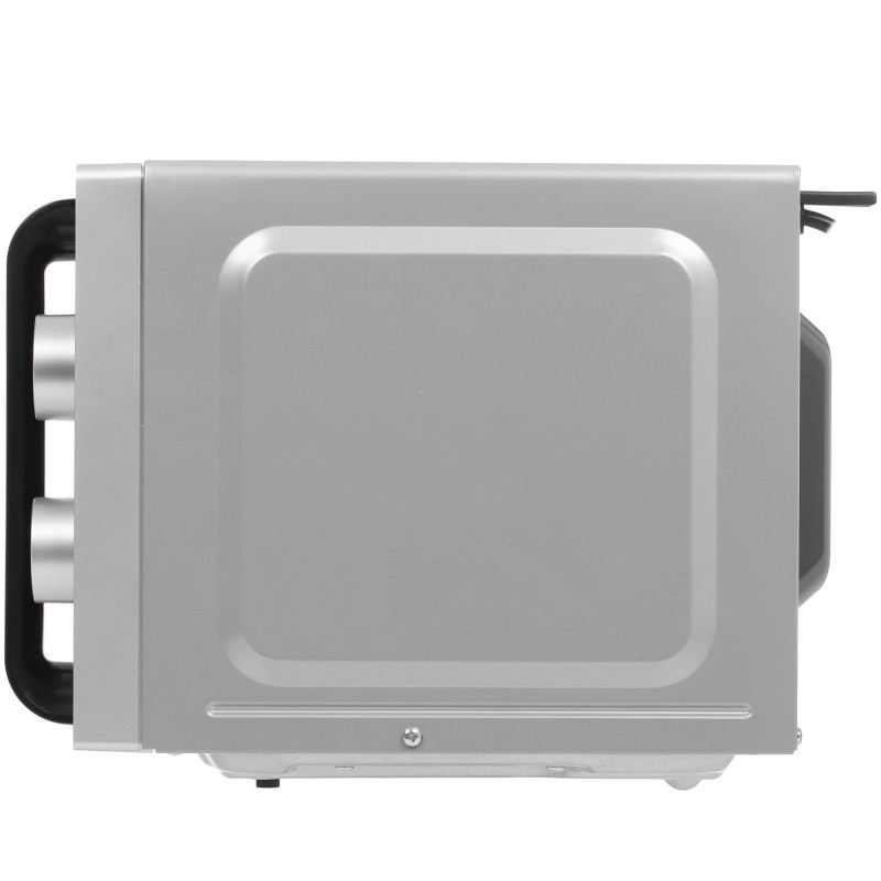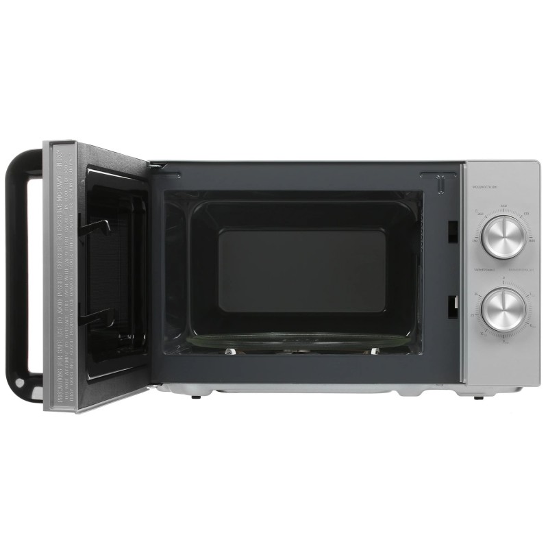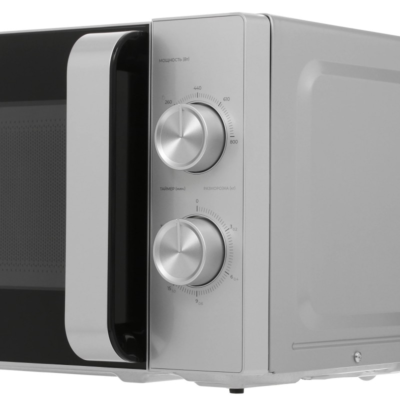 Микроволновая печь выполнена в корпусе серебристого цвета и оснащена внутренней камерой объемом 20 л. Покрытие из эмалированной стали устойчиво к повреждениям и легко очищается от загрязнений. Для управления мощностью микроволн и таймером с продолжительностью до 35 минут в микроволновой печи установлены механические поворотные регуляторы. Продукты размещаются на стеклянном поворотном поддоне диаметром 25.5 см, который вращается в процессе работы и обеспечивает равномерный нагрев. По завершению установленного времени подается звуковой сигнал.