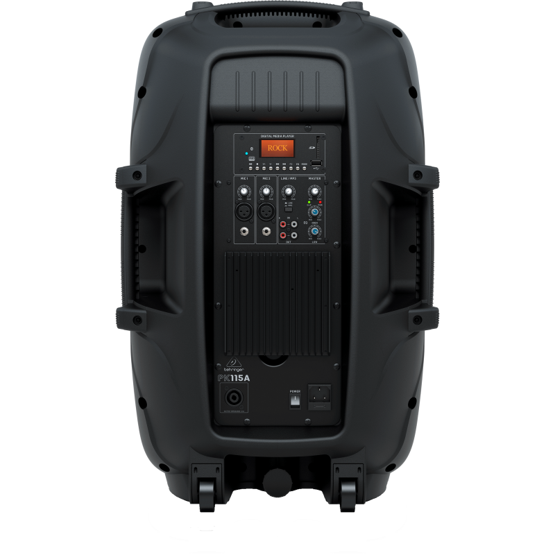 Behringer PK115A - это, двухполосная, активная акустическая система, с двумя динамиками - низкочастотным 15" НЧ с увеличенным ходом звуковой катушки и 1" компрессионным ВЧ твитером. На задней панели расположен аудиомикшер со встроенный медиаплеером с дисплеем, слотом для SD-карты, USB-портом и приемником Bluetooth. Микшер обладает двумя отдельными микрофонными / линейными входами, плюс линейный вход на тюльпанах, с регуляторами громкости и светодиодами перегрузки. 2-х полосный эквалайзер и встроенный DSP для максимального контроля и защиты динамиков от перегрузки. Сверхширокая дисперсия, широкоформатный экспоненциальный рупор. Линейный выход на задней панели усилителя позволяет подключать дополнительные акустические системы. Данная колонка является прекрасным решением для выездных мероприятий, семинаров и презентаций, рекламных акций или работы аниматоров. Не требуется отдельный микшер или проигрыватель, всё встроено в данную колонку.